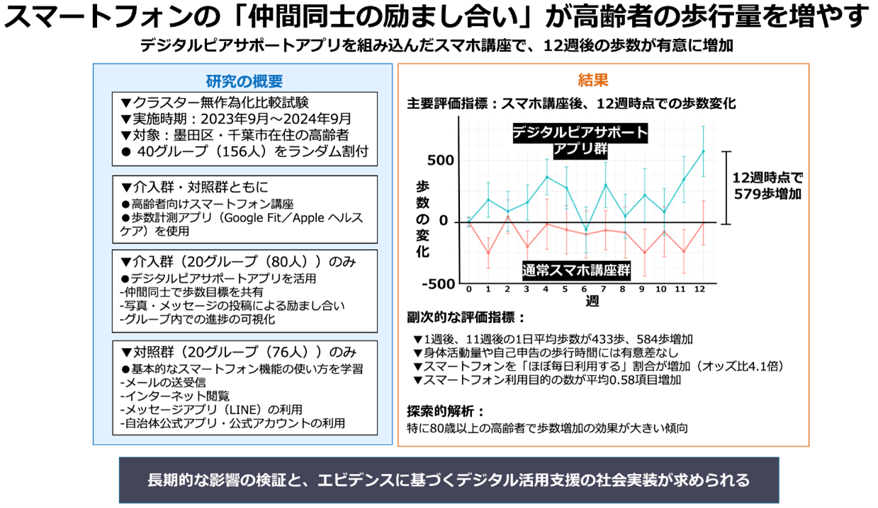 スマートフォンの「仲間同士の励まし合い」が高齢者の歩行量を増やす―ピアサポートアプリを組み込んだスマホ講座で、12週後の歩数が有意に増加―