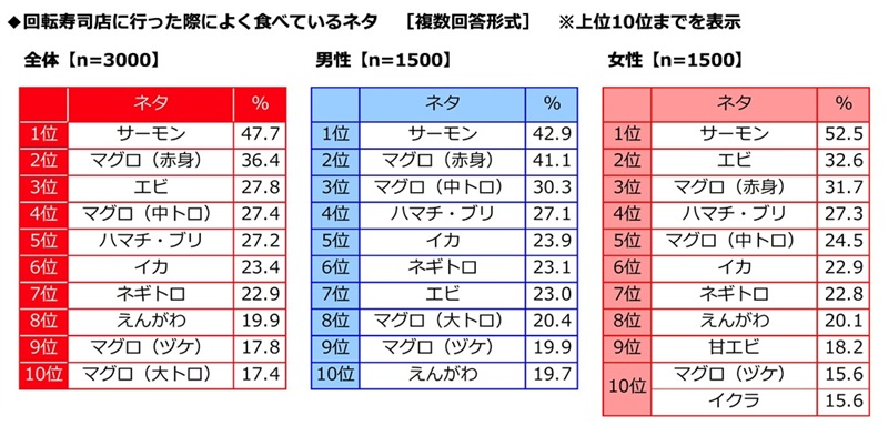 Umios調べ 回転寿司店でよく食べるネタ 「サーモン」が15年連続の1位