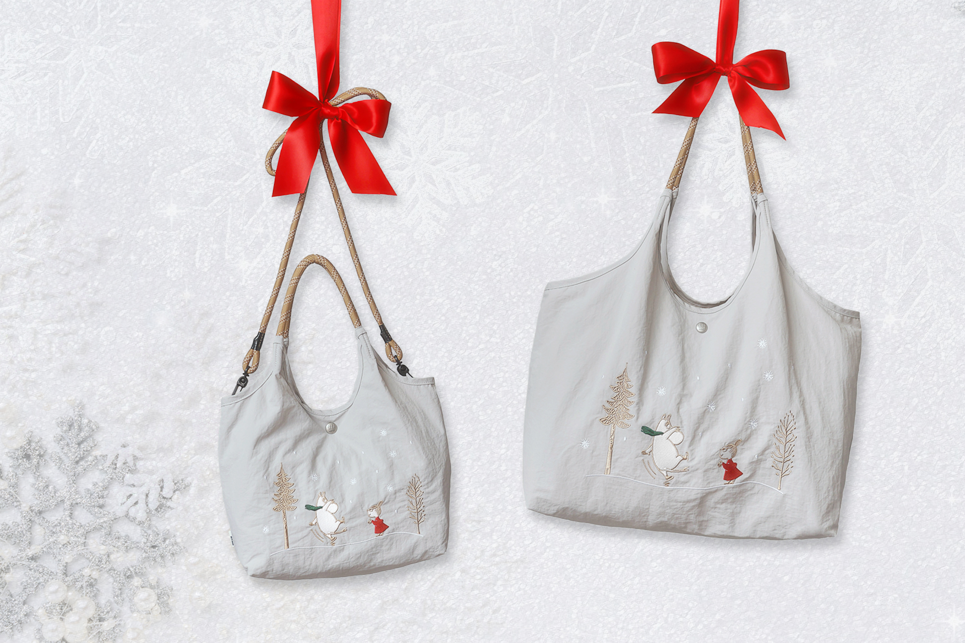 【ムーミン】心躍る冬の新作。雪景色をまとうアートのような刺繍バッグが登場。ムーミンとリトルミイが雪の日を楽しむ、心温まるワンシーンを表現。冬の装いを格上げする特別な軽いバッグでお出かけしませんか?
