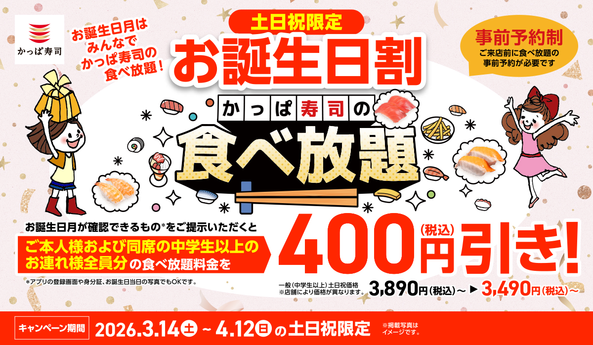 お誕生日月は、みんなでかっぱ寿司の食べ放題!“一緒に祝うと、みんなもおトク!” お誕生日月の方がいれば、ご本人様※と同一グループの皆さま全員※、食べ放題が土日祝価格より400円引きに!