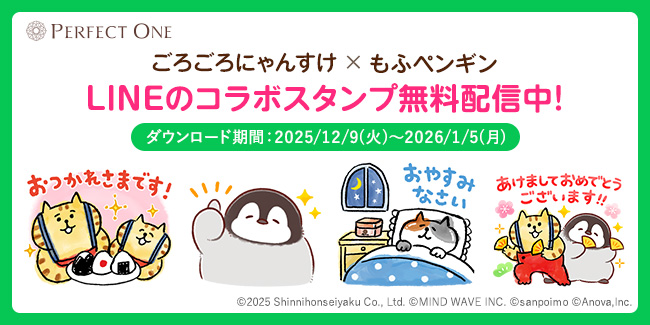 『パーフェクトワン』が人気キャラクター「ごろごろにゃんすけ」と「もふペンギン」とのコラボLINEスタンプを配信