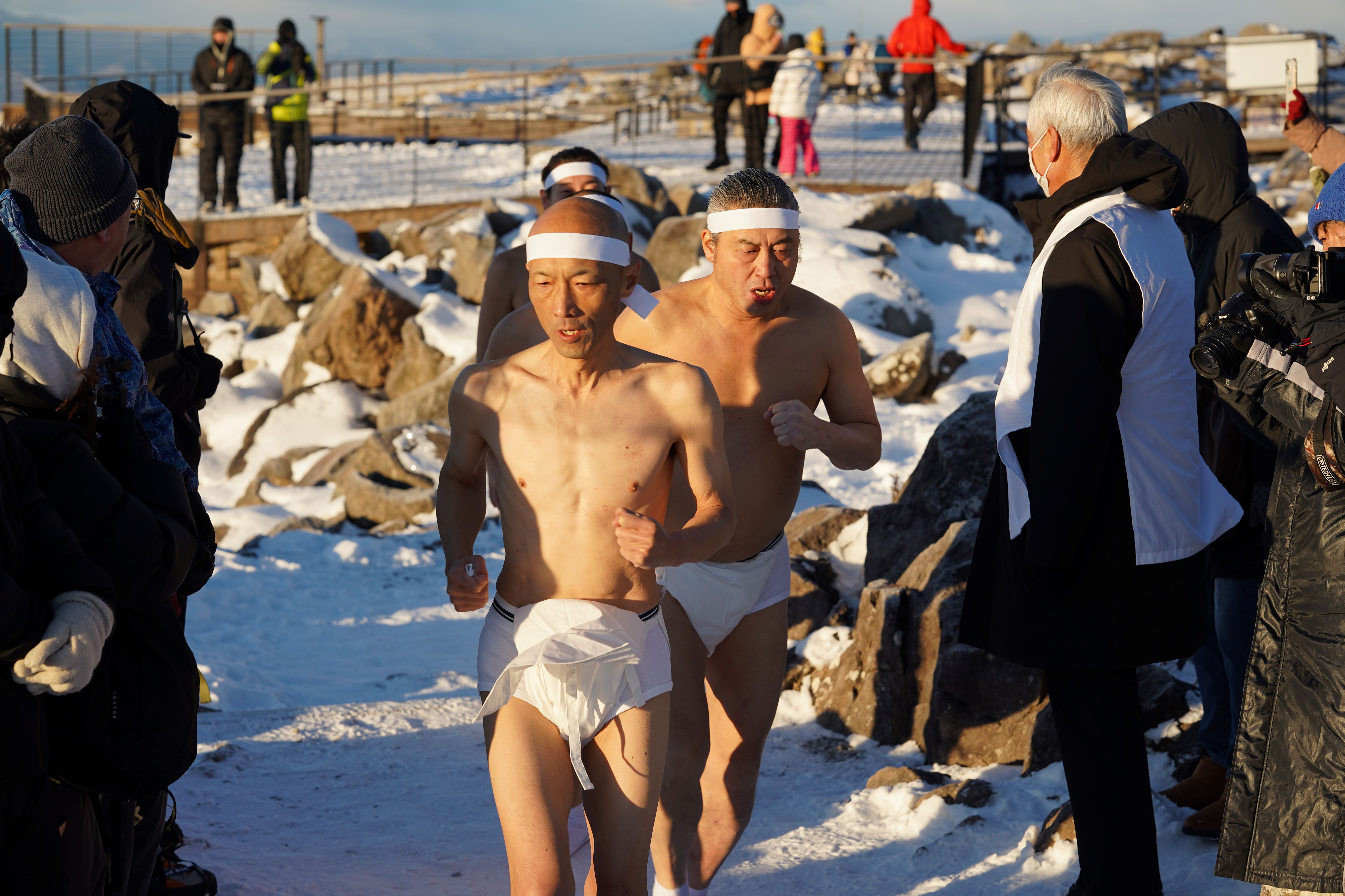 氷点下15℃、標高1925mの天空神社にて新春の祈り!極寒の中、男女5人が雪中禊をし、福男福女となり里におり餅を数百人に配る。