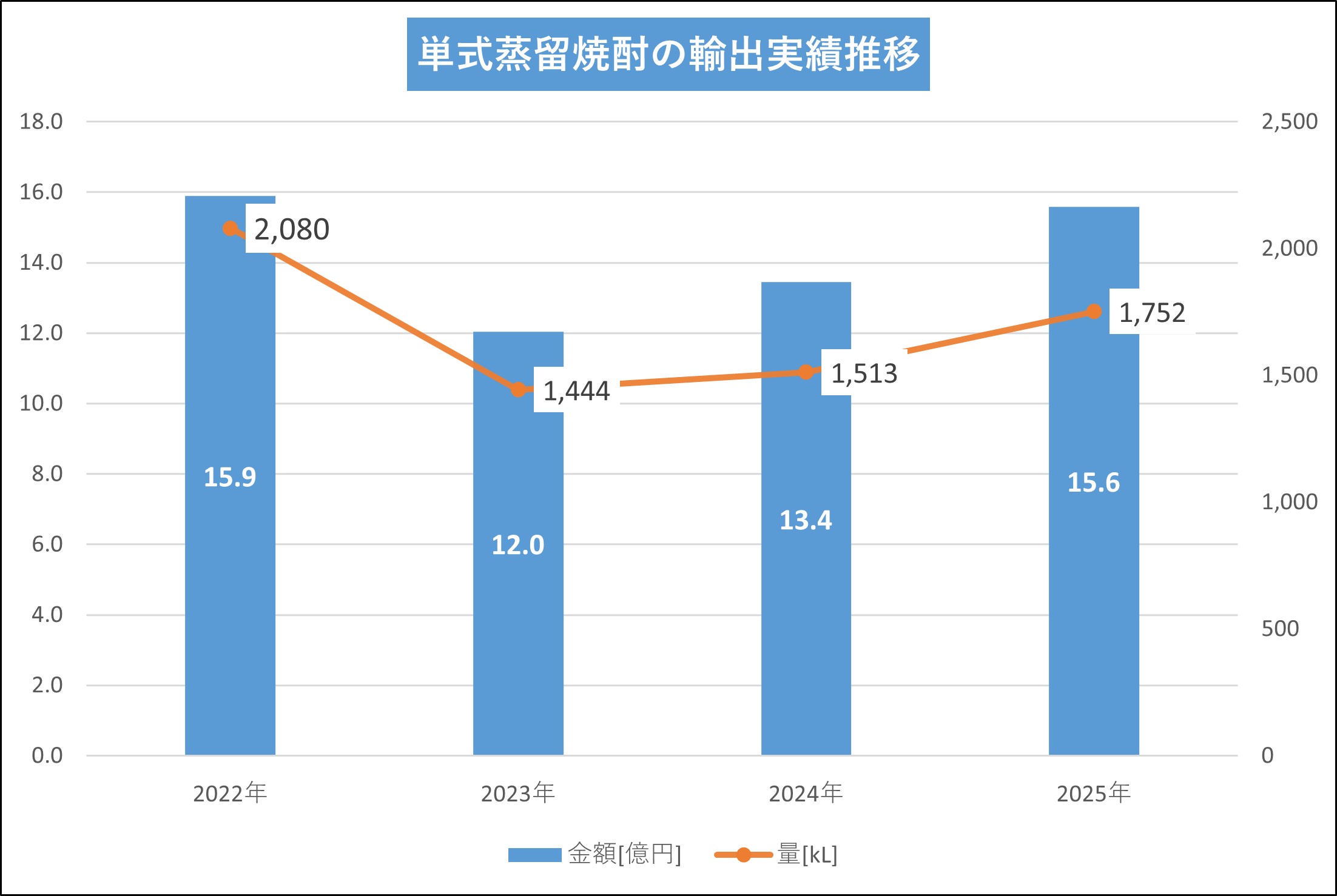 2025年度単式蒸留焼酎(本格焼酎・泡盛)輸出実績。輸出金額・数量共に前年度越え。輸出単価が過去最高を記録。2022年比で+16.5%と上昇。(PR TIMES グルメ)