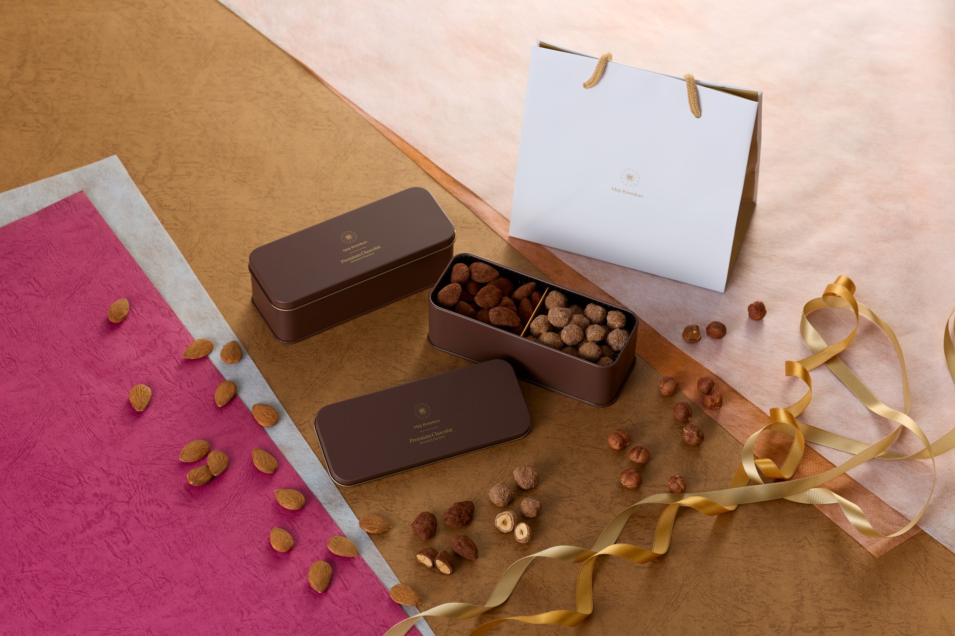 “明治記念館のパティシエが手仕込みで仕上げる、ローストした2種類のナッツの香ばしきショコラアンサンブル” 「アーモンド」と「ヘーゼルナッツ」のショコラ缶