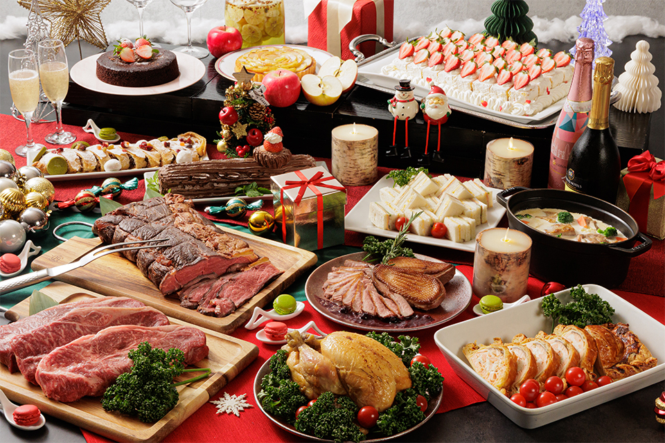サンタも思わず笑顔になる、クリスマスだけのごちそうが勢揃い!ステーキ、ローストチキン、キラキラデザートなど、みんなでワクワク楽しめるディナーブッフェ