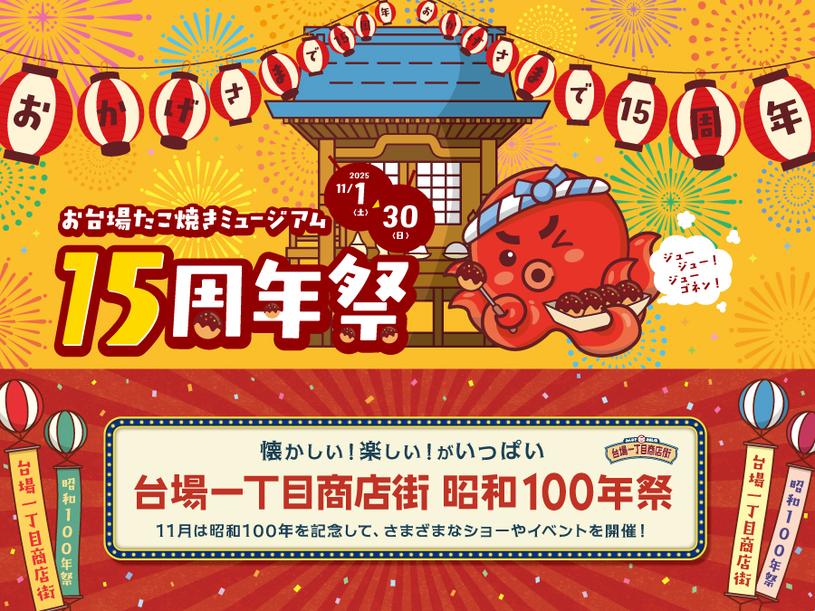 デックス東京ビーチ、「お台場たこ焼きミュージアム 15周年祭」「台場一丁目商店街 昭和100年祭」2025年11月1日(土)~11月30日(日)の期間限定で開催(PR TIMES グルメ)