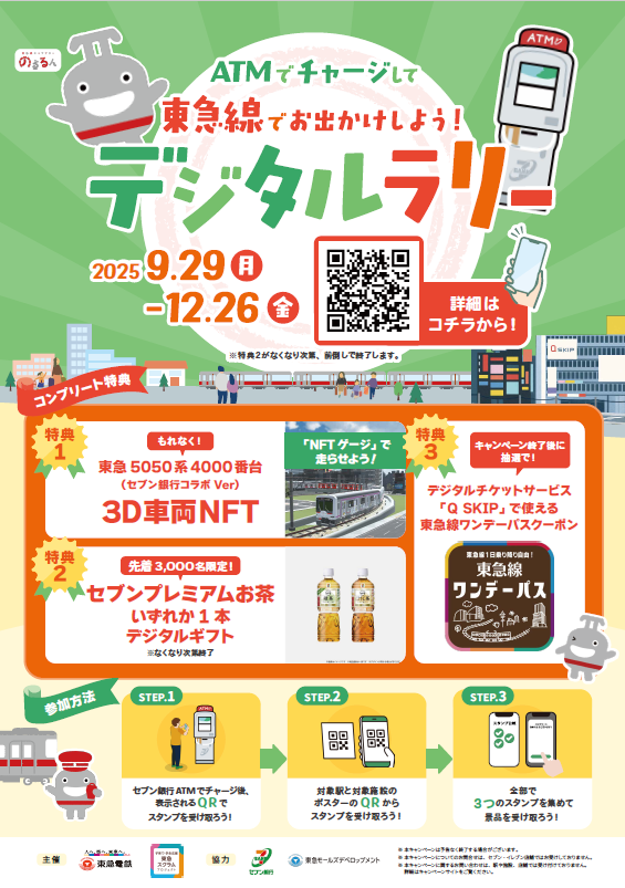 セブン銀行と初コラボ!3D車両NFTやQ SKIPクーポンなどの豪華特典の獲得チャンスがある「ATMでチャージして、東急線でお出かけしよう!デジタルラリー」を実施します