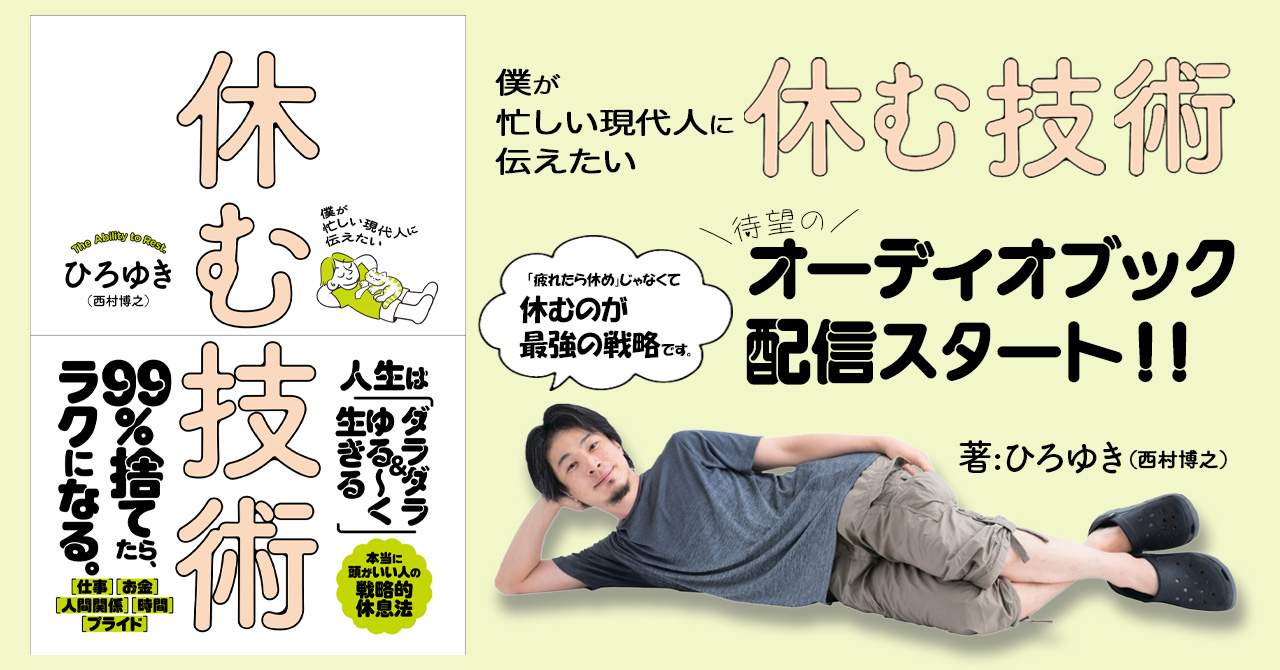 ひろゆきが実践する【本当に頭がいい人の戦略的休息法】とは? がんばりすぎな、あなたに贈る本『僕が忙しい現代人に伝えたい 休む技術』がオーディオブックに