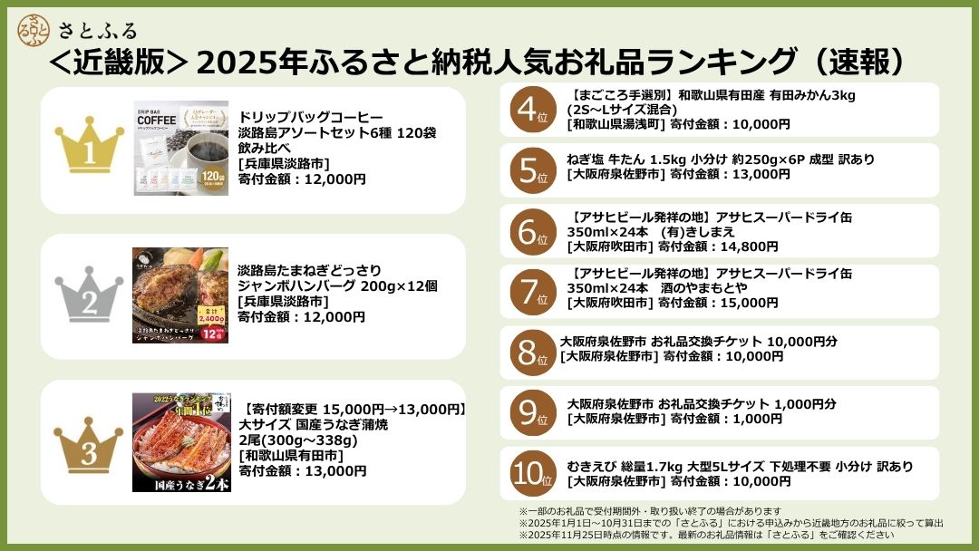 【さとふるニュースレター】<近畿版>2025年ふるさと納税人気お礼品ランキング(速報)
