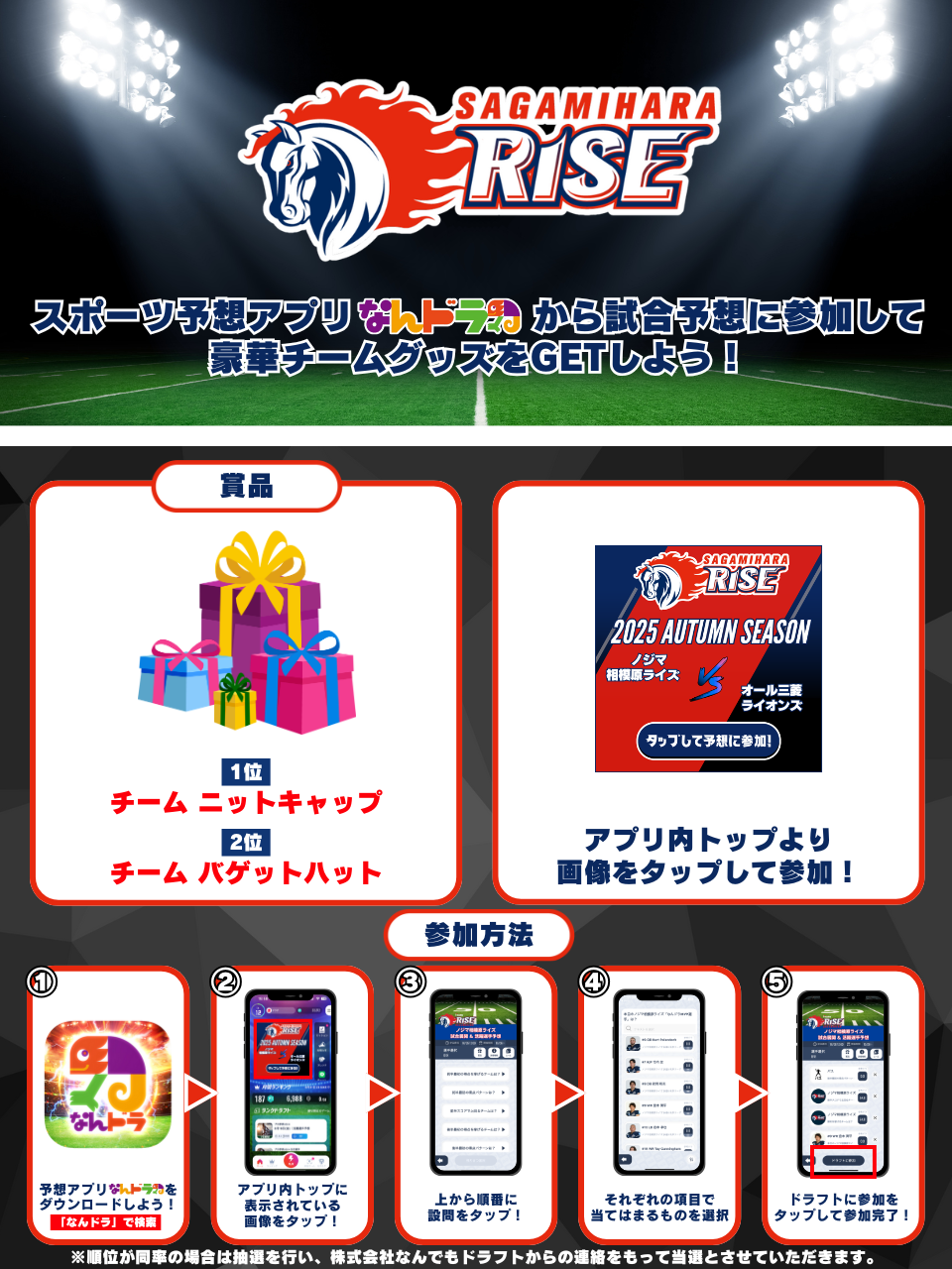 Xリーグ 2025 秋季リーグ 10月26日(日)ノジマ相模原ライズの試合展開&活躍選手予想をスポーツ予想アプリ「なんドラ」で開催!