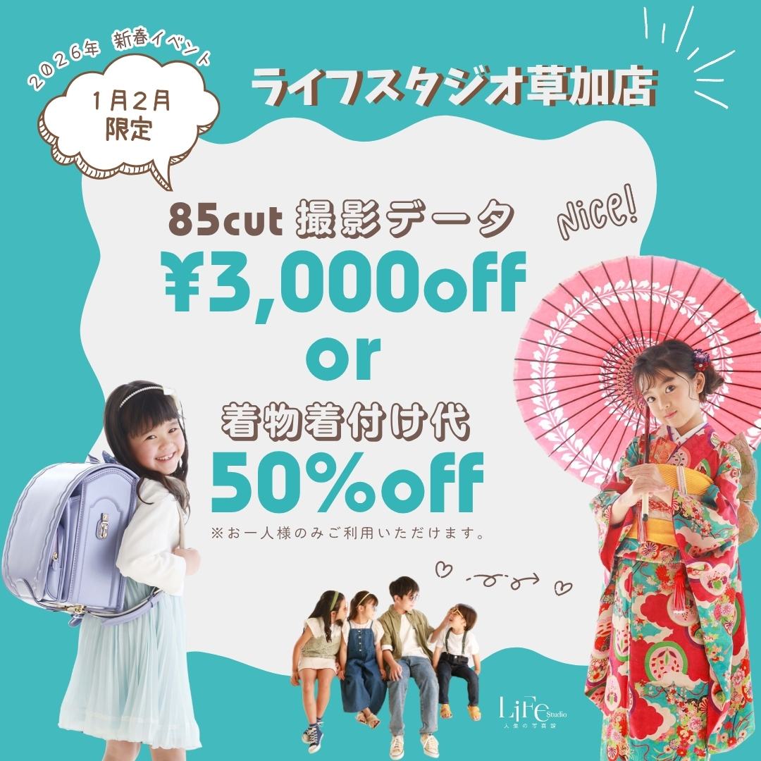 【ライフスタジオ草加店限定】2026年1~2月 新春キャンペーン|撮影データ3,000円OFF または 着付け(1名様)50%OFF!