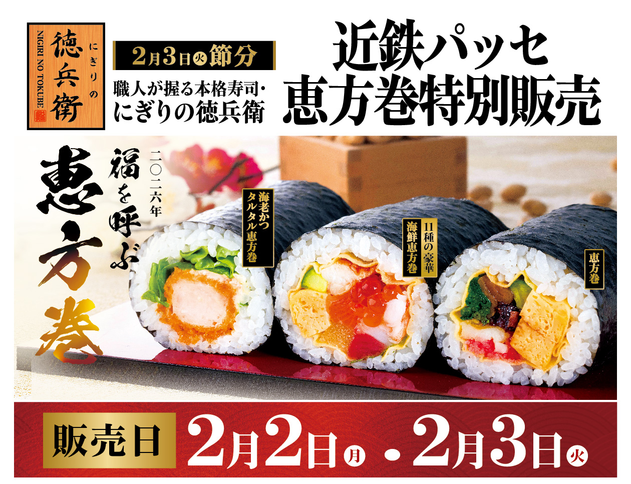 名古屋駅等で手軽に寿司屋の恵方巻が買える!「にぎりの徳兵衛の恵方巻」を近鉄パッセで特別販売!2026年2月2日(月)・3日(火)の2日間限定