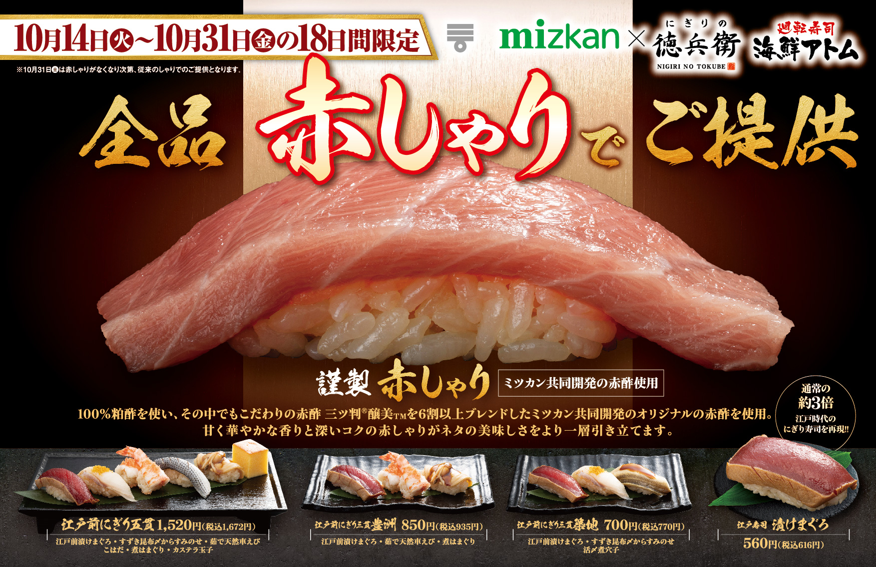 18日間限定!全品《謹製 赤しゃり》でご提供!通常の3倍の大きさ!?江戸時代のにぎり寿司を再現!!10月14日(火)よりにぎりの徳兵衛・海鮮アトムにて登場。