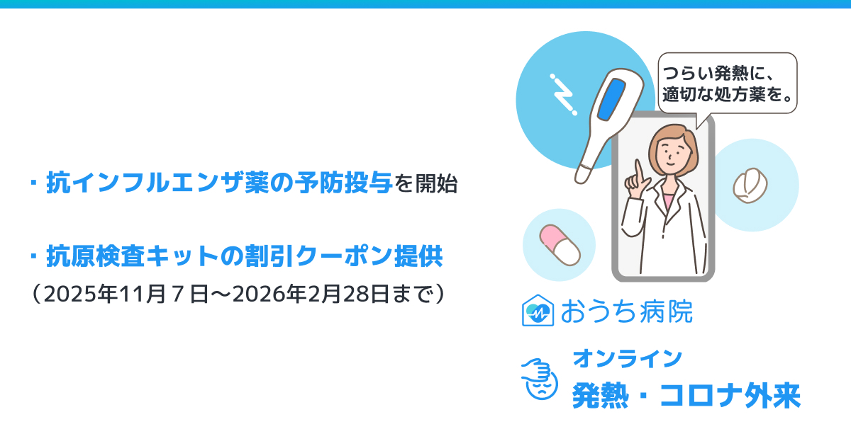 おうち病院、今冬は“発症前に先手”-抗インフルエンザ薬の予防投与を提供開始。合わせて、感染症流行期に備える啓発活動として検査キットの20%OFF提供も実施(※11月~2月の事前備蓄推奨)