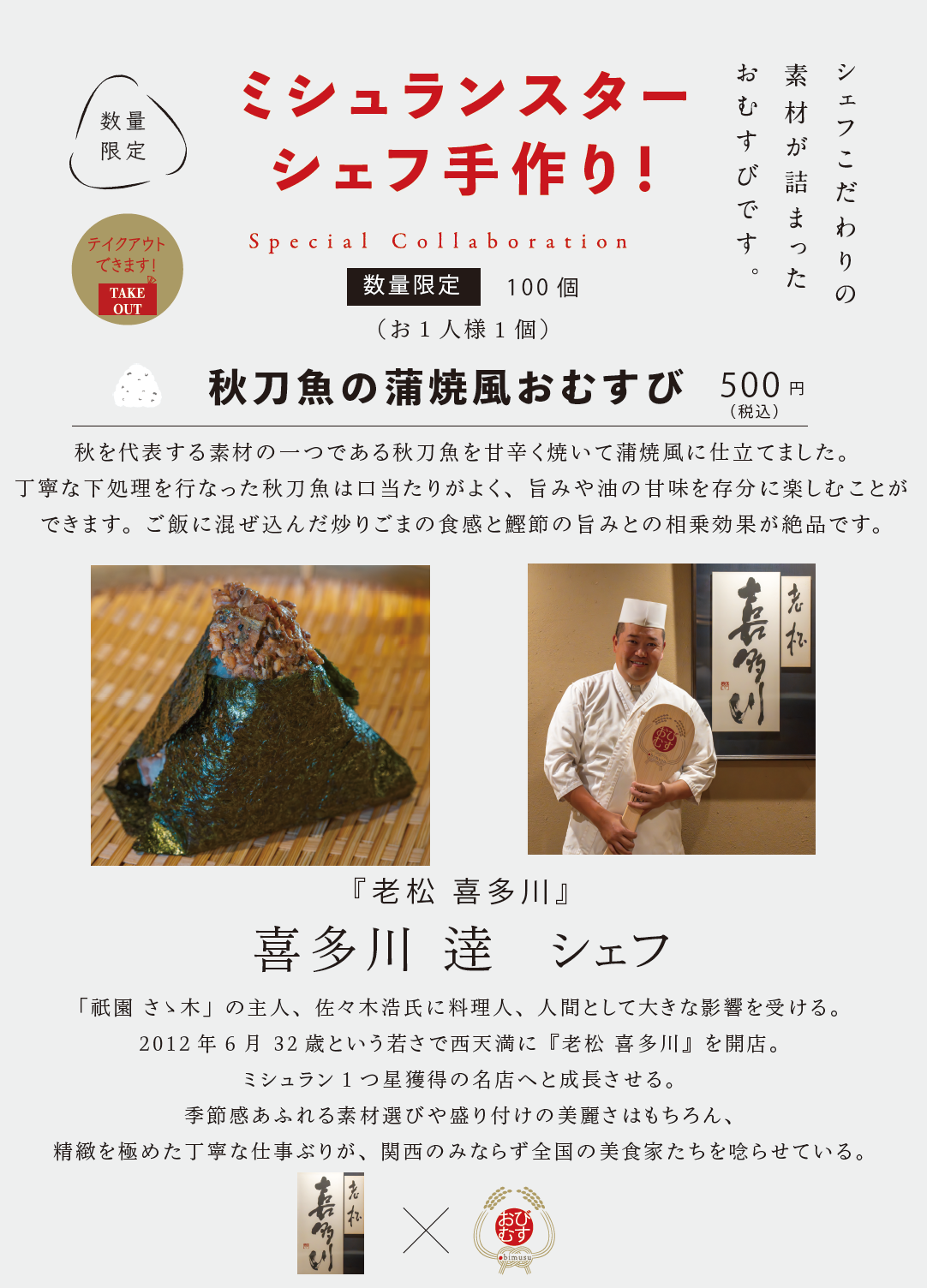 ミシュランスターシェフの手作りおむすび!シェフ自らが作った具材で握る夢のコラボレーション!『老松 喜多川』の作る一品は「秋刀魚の蒲焼風おむすび」10月10日より100個限定、500円で提供開始!