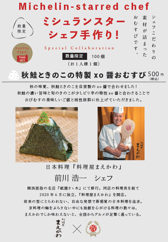 ミシュランスターシェフの手作りおむすび!シェフ自らが作った具材で握る夢のコラボ!『料理屋まえかわ』の作る一品は「秋鮭ときのこの特製xo醤おむすび」11月7日より100個限定、500円で提供開始!