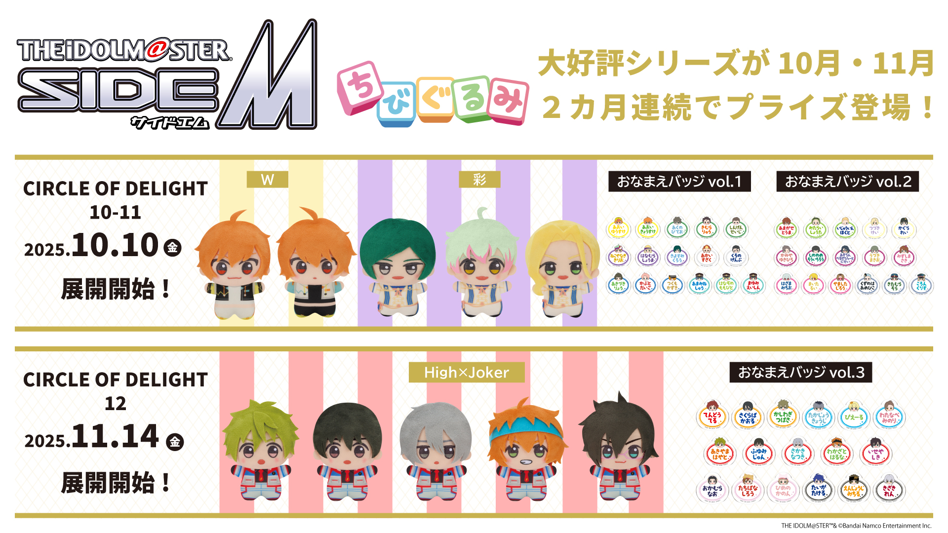 「アイドルマスター SideM」よりWと彩の「ちびぐるみ」と「ちびぐるみ」イラストデザインの「おなまえバッジ」が10月10日(金)よりモーリーファンタジー・PALOにて展開開始!