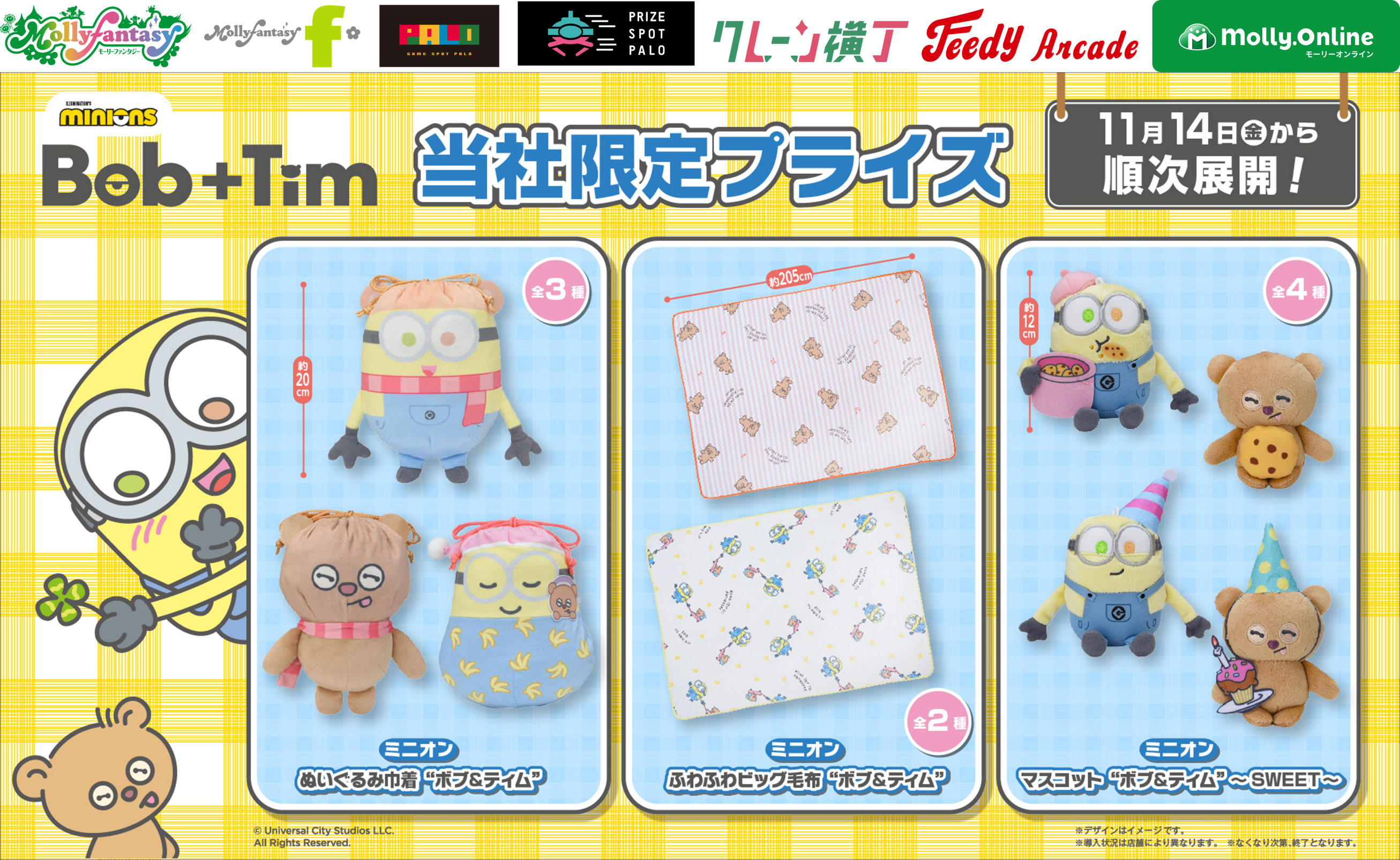 『ミニオン』の人気コンビ「ボブ+ティム」の限定プライズが登場!ふわふわの「ビッグ毛布」やかわいい「マスコット」などを11月14日(金)よりモーリーファンタジー・PALOにて展開開始
