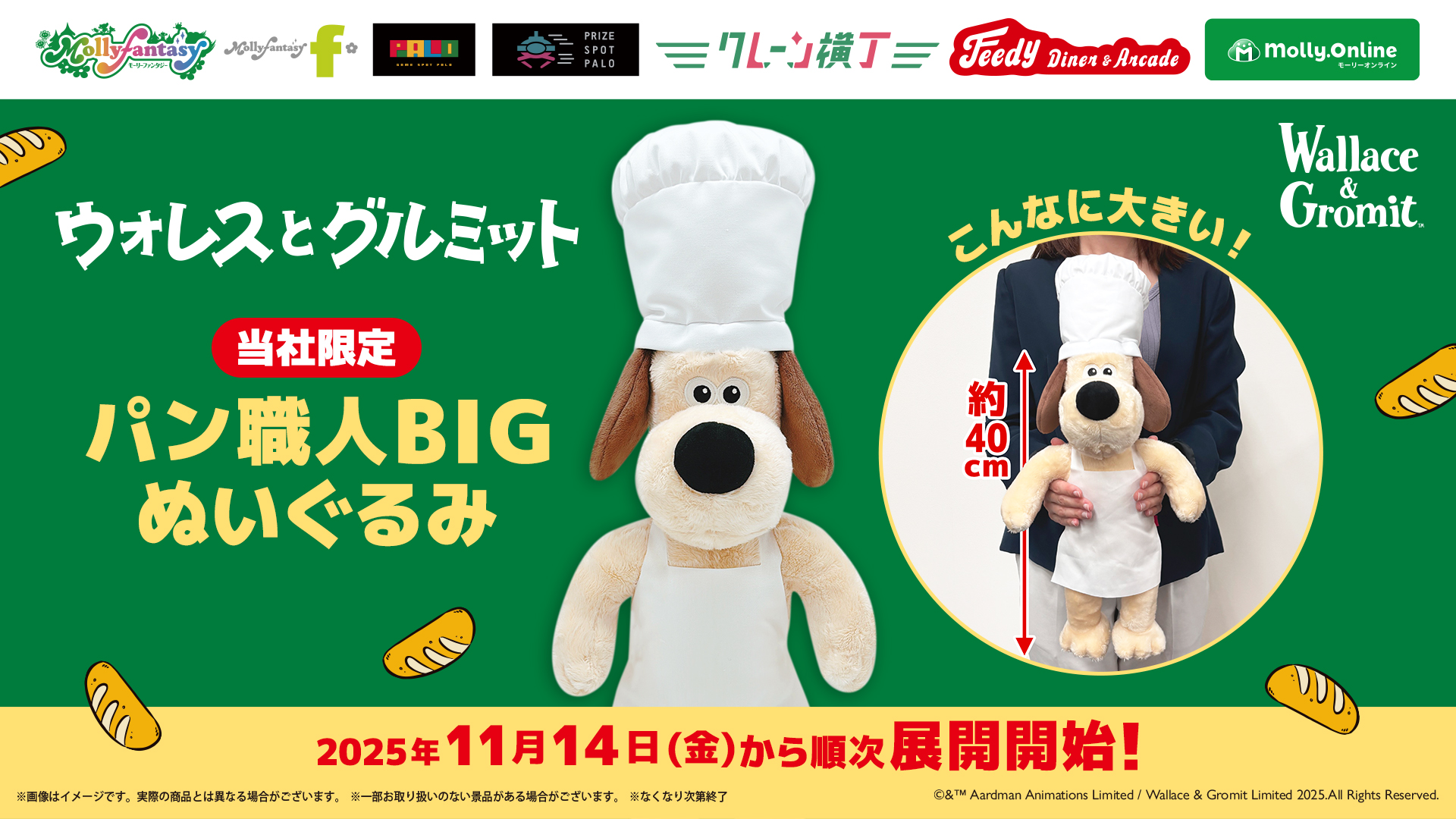 「ウォレスとグルミット」のグルミットが「パン職人」姿でプライズ初登場! 約40cmの「ウォレスとグルミット パン職人BIGぬいぐるみ」を11月14日(金)よりモーリーファンタジー・PALOにて展開開始