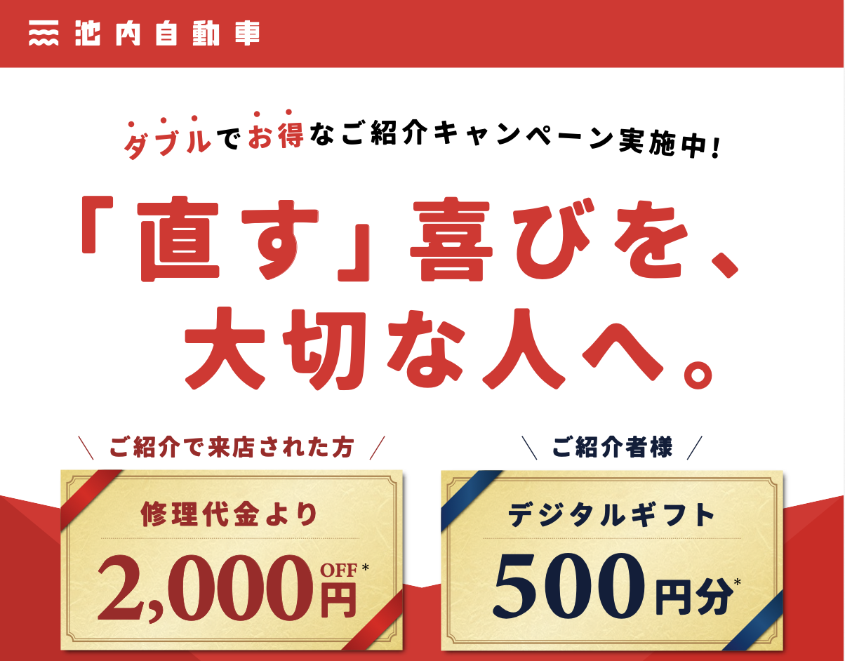 【地域で広がる安心の輪】板金塗装の池内自動車が「ご紹介特典カード」を導入。紹介された方は修理代2,000円OFF、紹介者にはデジタルギフトを贈呈