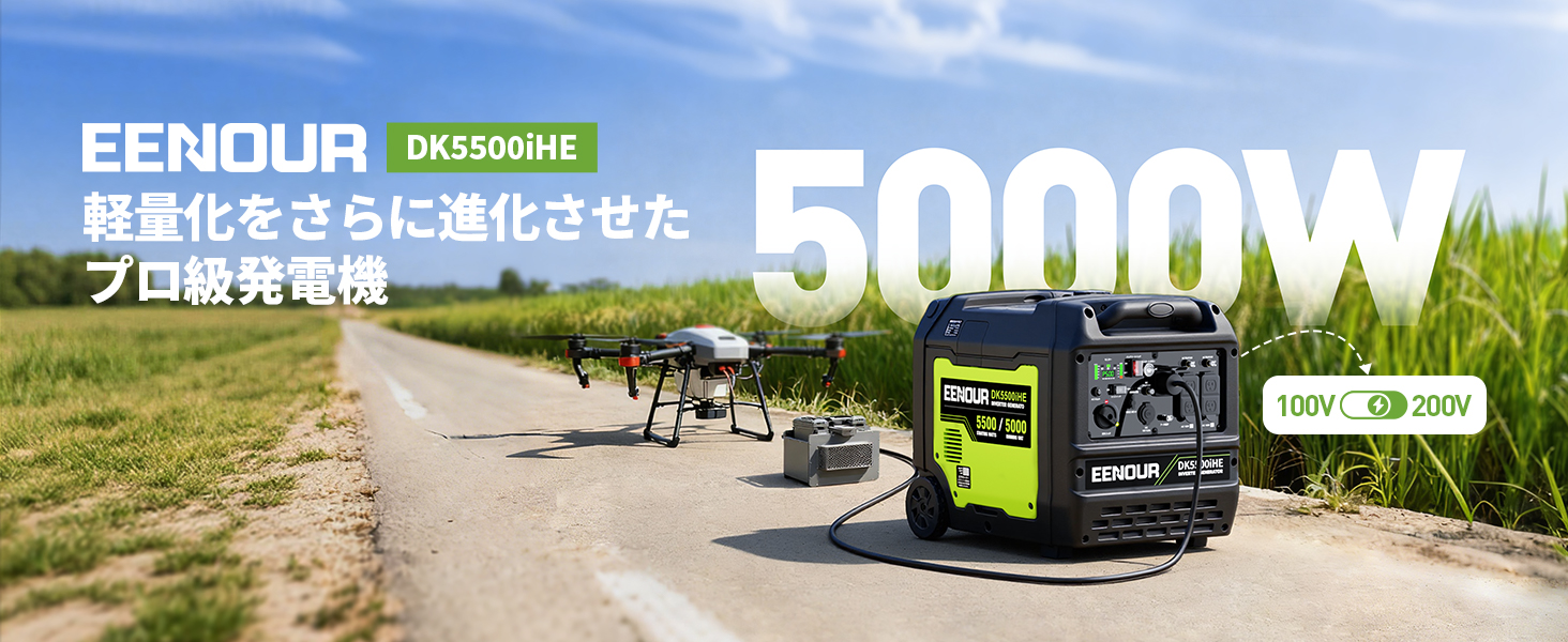 5000W大出力×約42kgの超軽量設計!100V/200V両対応EENOUR インバーター発電機「DK5500iHE」新登場