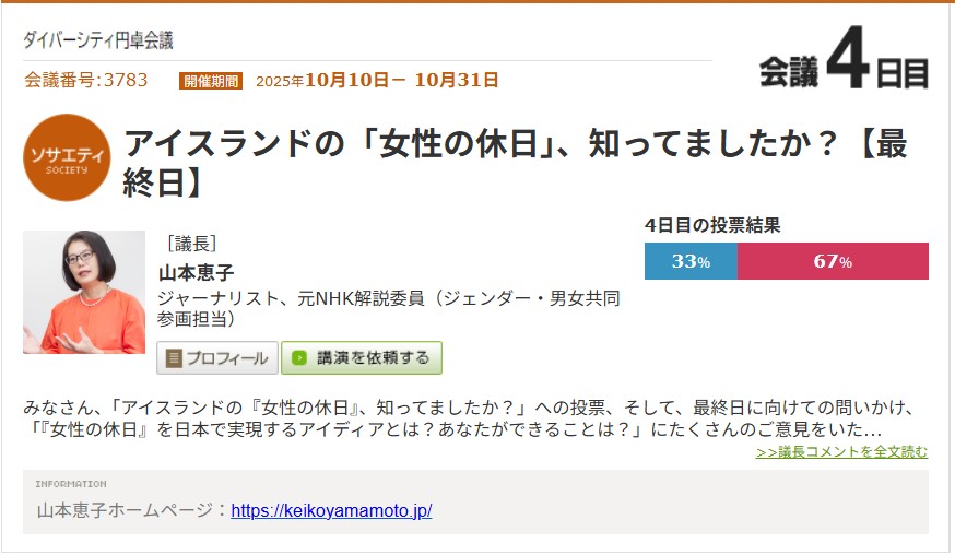 アイスランドで実現している「女性の休日」、知っている人は33%。女性が1日、仕事も家事も休むとどうなる? 元NHK解説委員の山本恵子氏(ジェンダー・男女共同参画担当)と議論白熱!