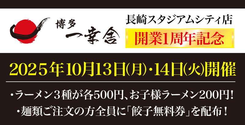 【元祖泡系博多一幸舎】 長崎スタジアムシティ店が開業1周年!2025年10月13日(月)・14日(火)の2日間は数量限定「ラーメン」1杯を特別価格の500円でご提供いたします!