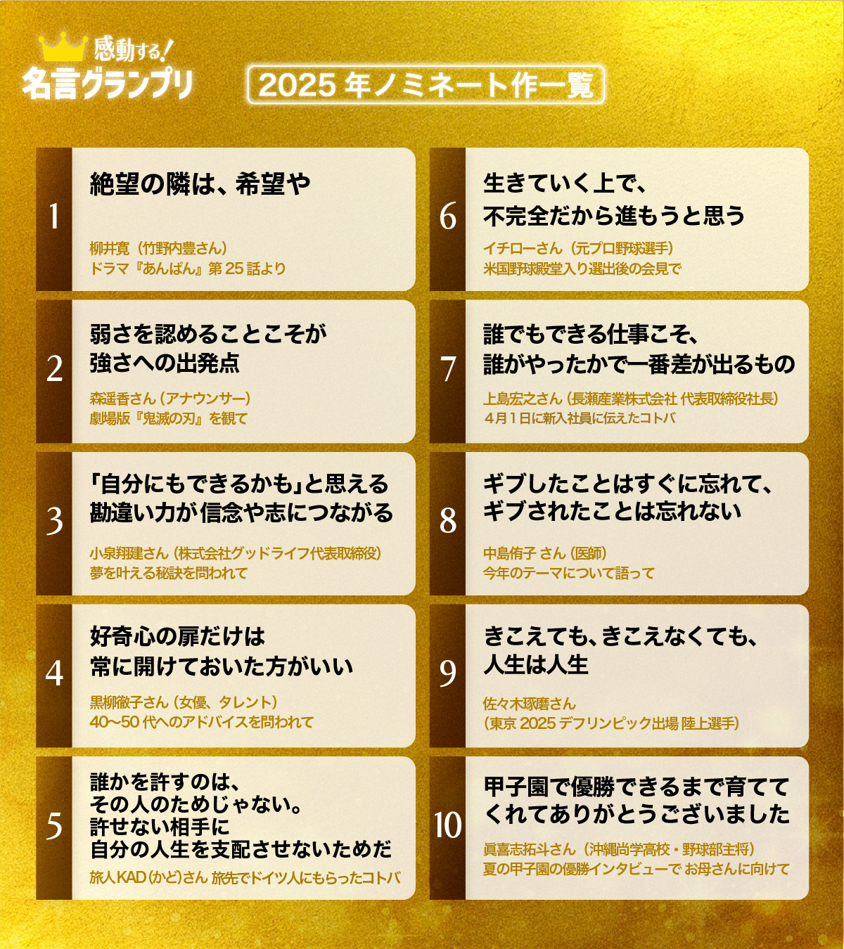 『あんぱん』の名言「絶望の隣は、希望や」ほか、イチロー選手、黒柳徹子さんら名言がノミネート!2025年「感動した!」コトバは?第9回「名言グランプリ」開催!