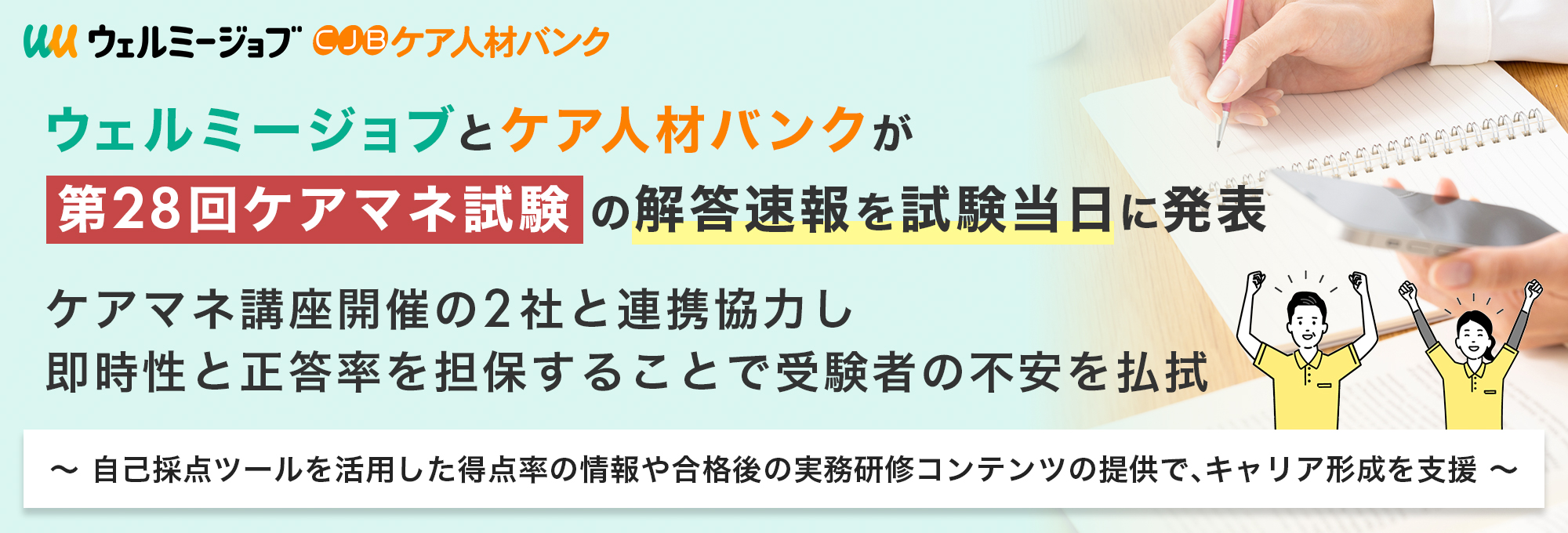 ウェルミージョブとケア人材バンクが第28回ケアマネ試験の解答速報を試験当日に発表。ケアマネ講座開催の2社と連携協力し即時性と正答率を担保することで受験者の不安を払拭