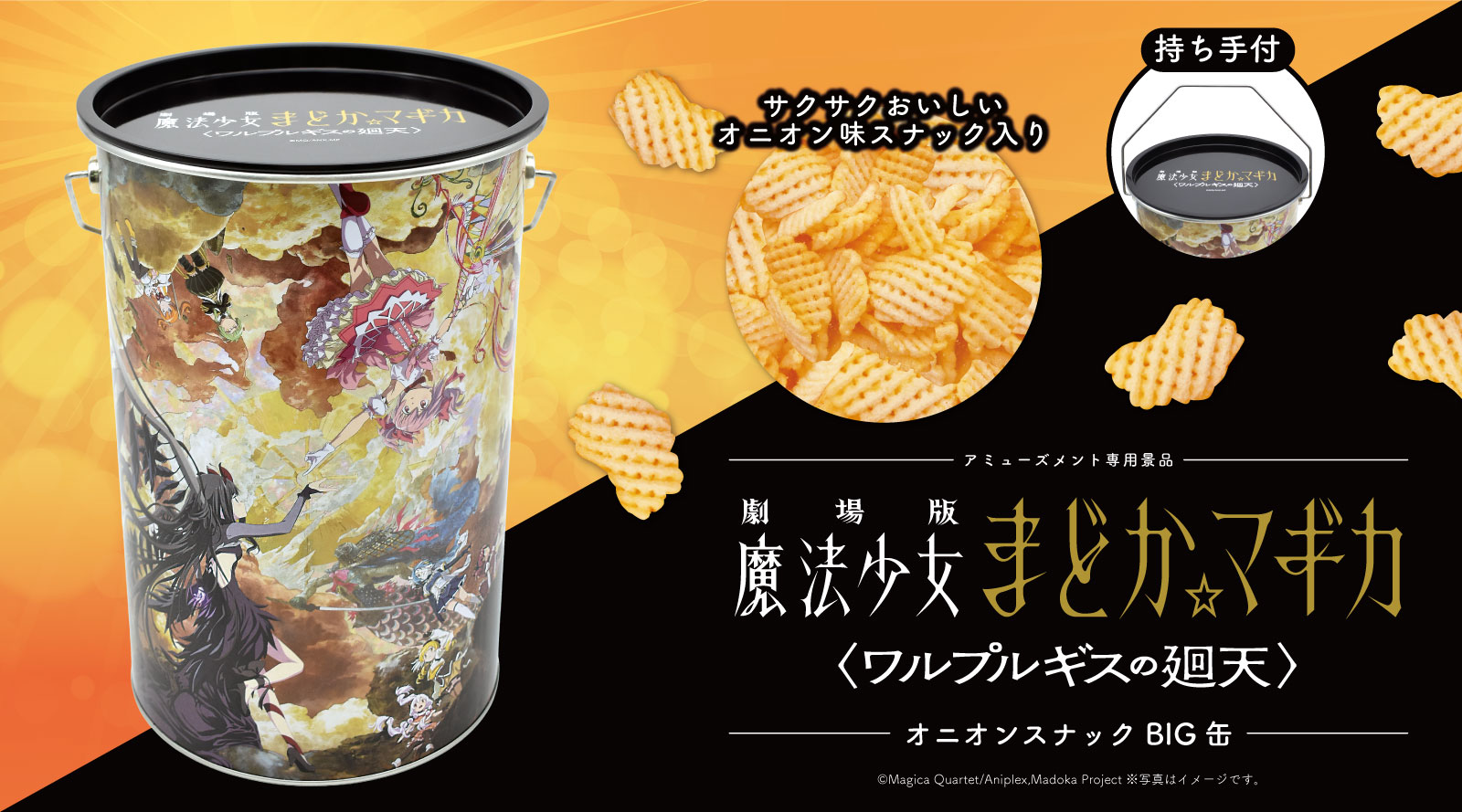 「劇場版 魔法少女まどか☆マギカ 〈ワルプルギスの廻天〉」オニオンスナック入りのBIG缶がアミューズメント施設・オンラインクレーンゲームにて3月に登場!