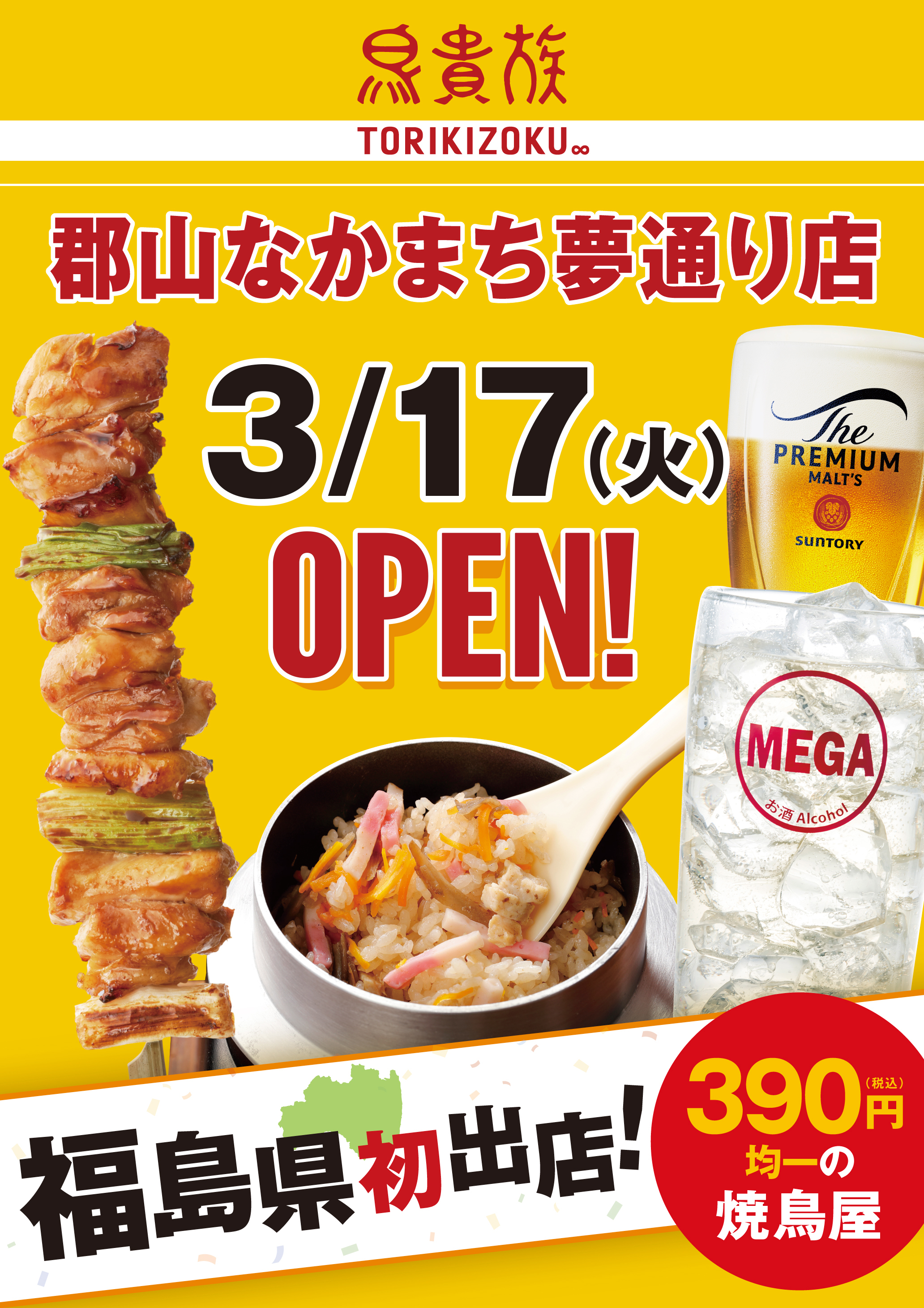 焼鳥屋「鳥貴族」、福島県初出店(東北エリア2県目)となる郡山なかまち夢通り店を3月17日にオープン