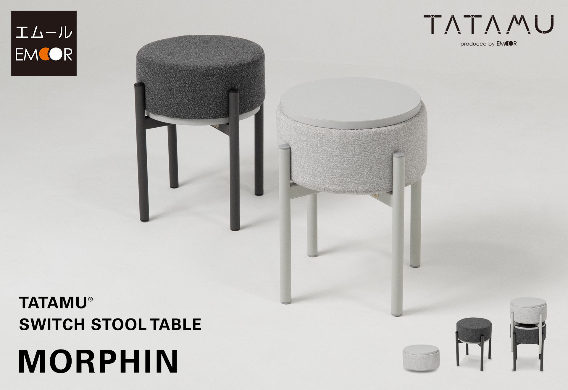 トランスフォーム家具ブランドTATAMU(R)から、シーンによってテーブル⇔スツールと役割をスイッチできるスタッキングスツール「MORPHIN(モーフィン)」が新登場。