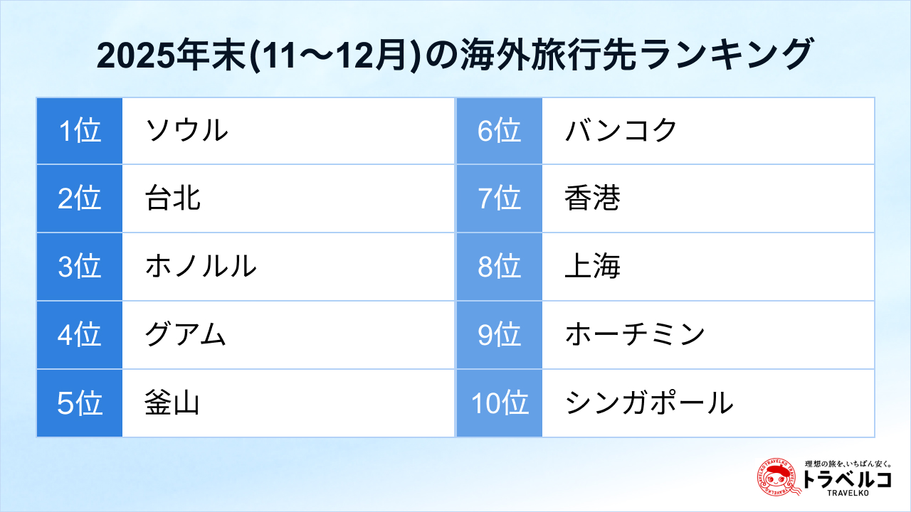 トラベルコ、年末(11~12月)の海外旅行先人気ランキングを発表