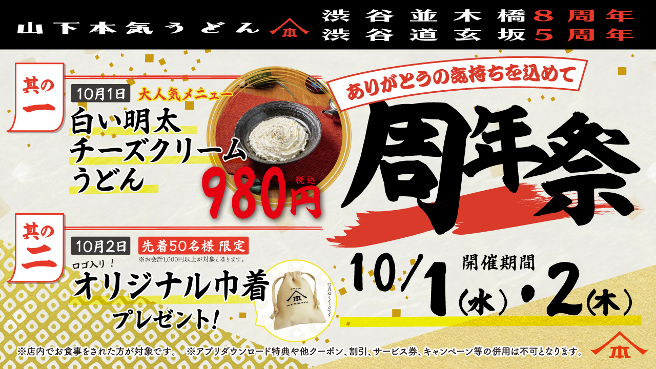 山下本気うどん渋谷並木橋・渋谷道玄坂「周年祭」を開催!! 渋谷に店を構えて8周年&5周年!