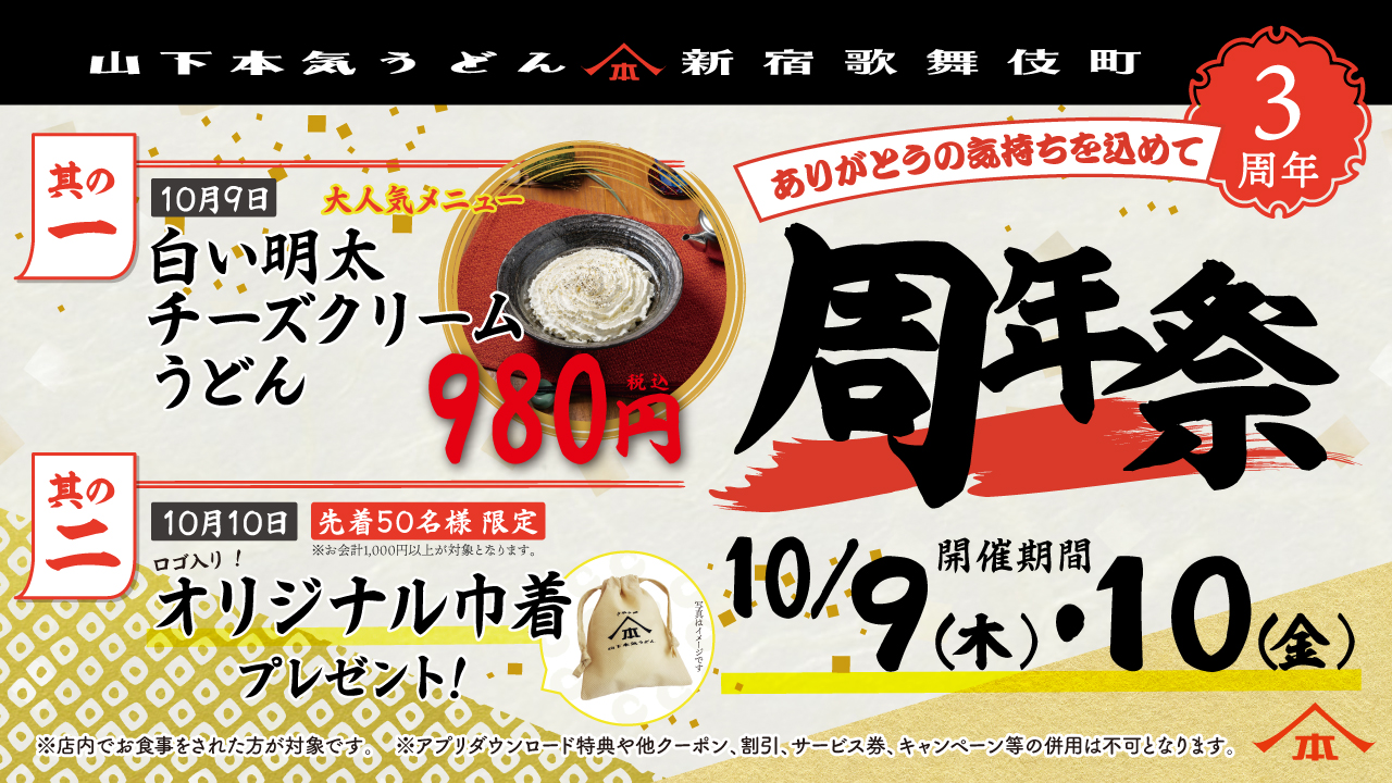 山下本気うどん 新宿歌舞伎町「周年祭」開催 オープンから累計約38万人※1のお客様がご来店!