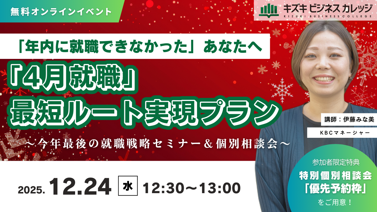 「年内に就職できなかった」あなたへ~「4月就職」最短ルート実現プランとは?~今年最後の就職戦略セミナー&個別相談会~【12/24開催/無料/オンライン】