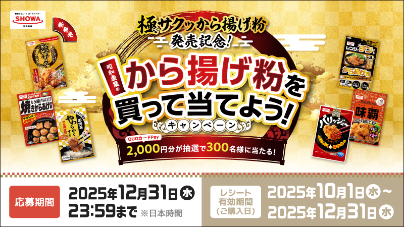 【昭和産業】極サクッから揚げ粉発売記念!QUOカードPay2,000円分が抽選で300名様に当たる「昭和産業のから揚げ粉を買って当てよう!キャンペーン」が10月1日(水)より開催