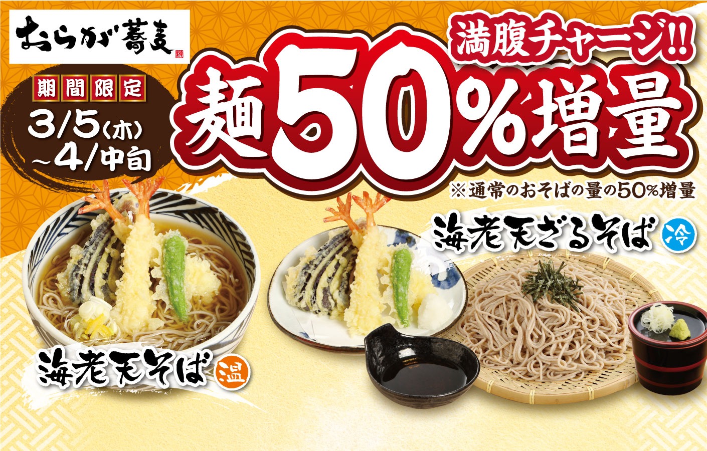 【おらが蕎麦】全力応援!! 期間限定「満腹チャージ!! 麺50%増量」キャンペーンを3月5日(木)より実施します。