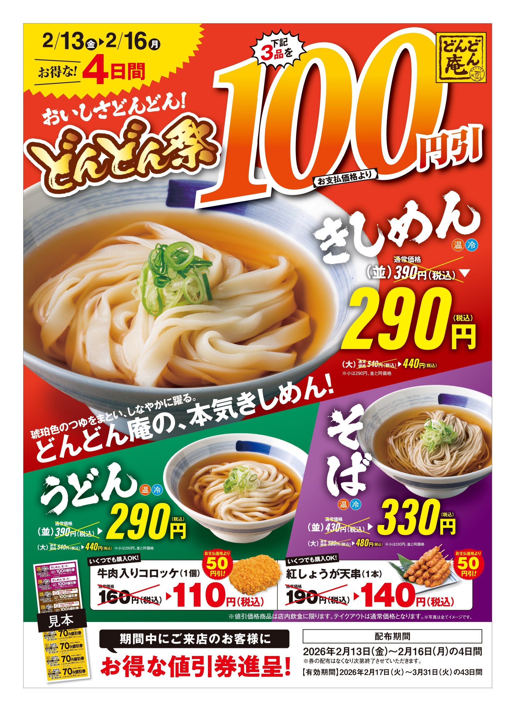 【どんどん庵】全店開催!自慢の「きしめん」含む麺3品が100円引2月13日(金)より、4日間限定の『どんどん祭』がスタート!