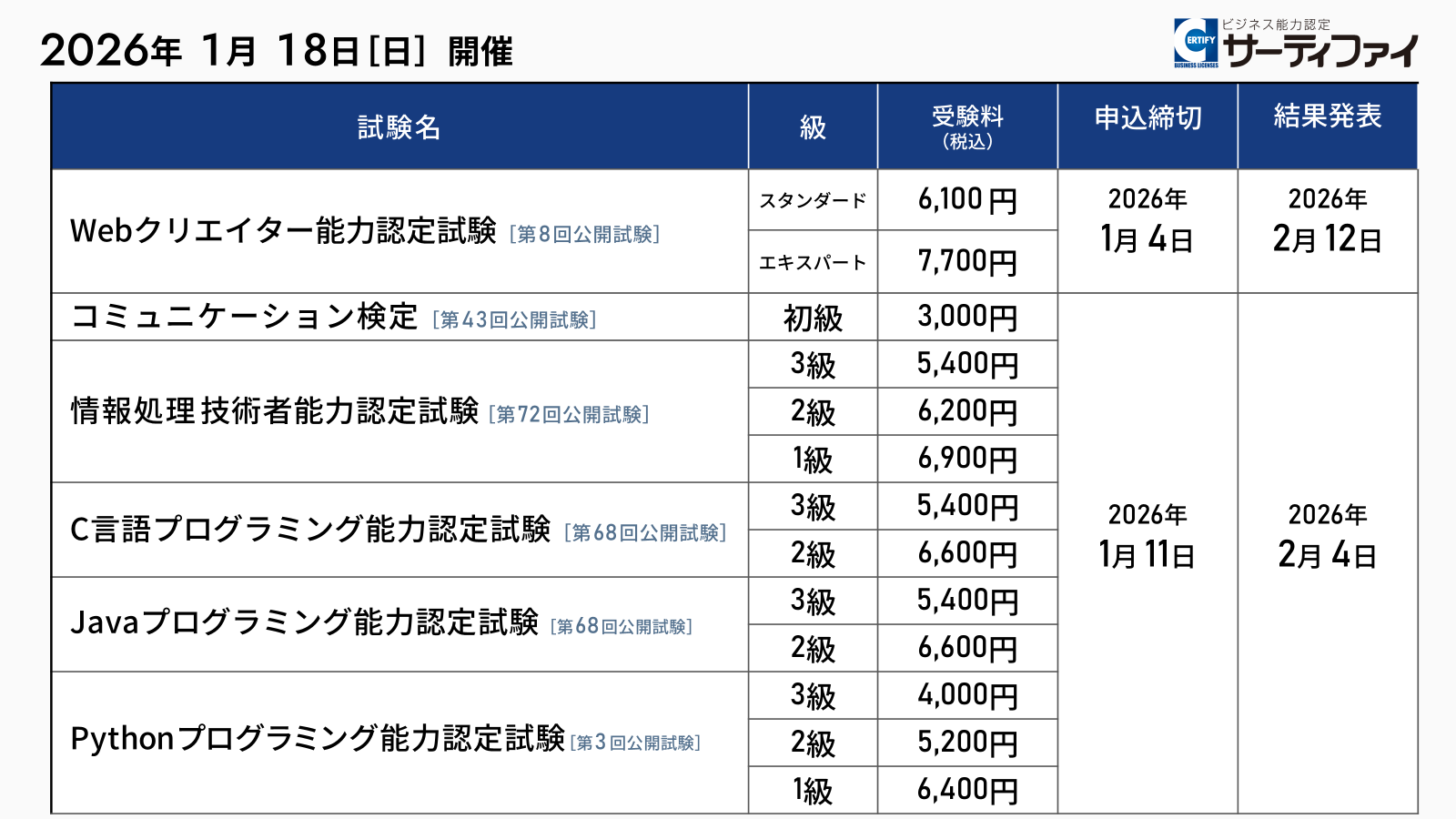 「C言語プログラミング能力認定試験」「Javaプログラミング能力認定試験」「Pythonプログラミング能力認定試験」ほか6試験の公開試験申込受付を開始【試験日:2026年1月18日】