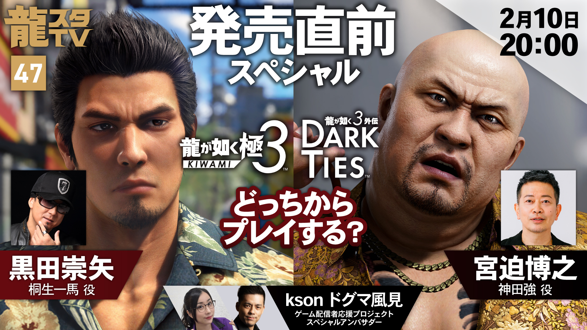2月10日(火)配信の「龍スタTV」は黒田崇矢さん・宮迫博之さんが登場!『龍が如く 極3 / 龍が如く3外伝 Dark Ties』発売直前スペシャル!