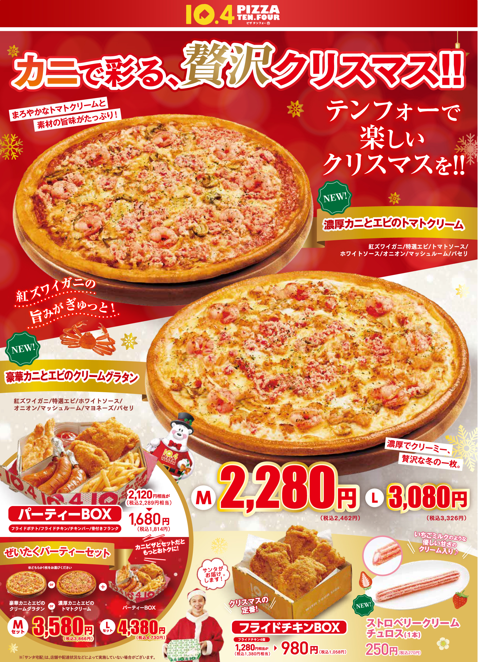 【テンフォー】冬のごちそう、カニの旨味たっぷりの贅沢ピザで楽しむクリスマス!パーティーにもおすすめのサイドメニューがぎっしり詰まったお得なBOXも限定復刻!