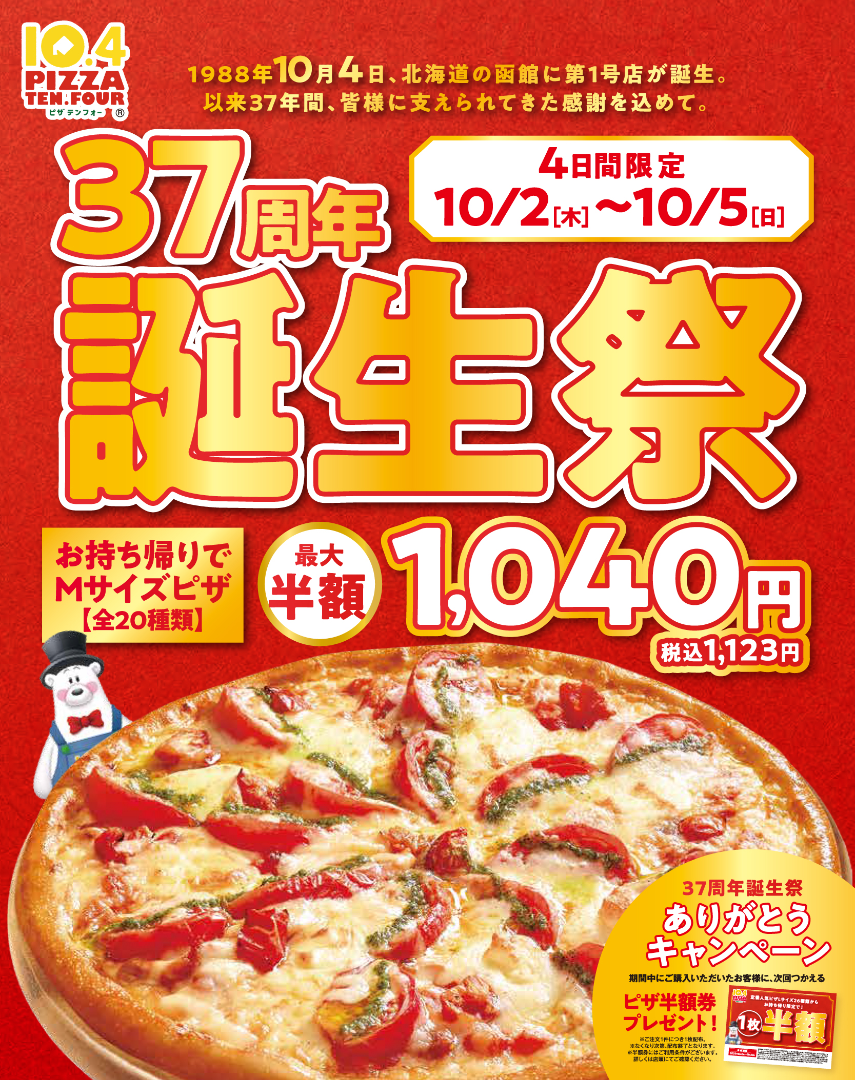 【10月4日はテンフォーの日】祝37周年!今年もお客様に感謝の気持ちを込めて誕生祭を開催いたします。ピザMサイズがテンフォー価格(税抜1,040円)、最大半額になる超BIGセールです!