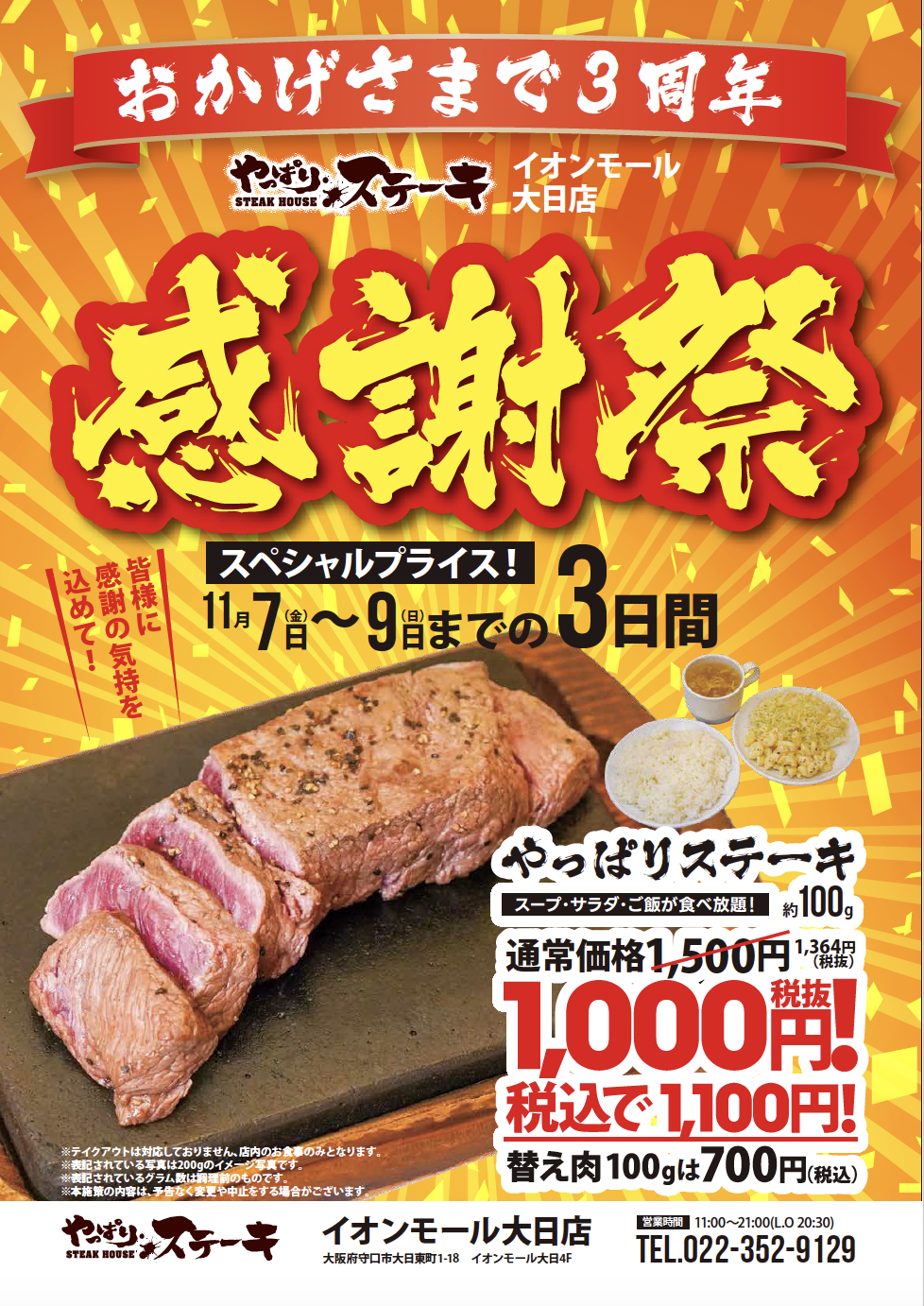 【やっぱりステーキ】やっぱりステーキ イオンモール大日店が3周年11月7日からの3日間限定で周年祭だけのスペシャルプライスでご提供!