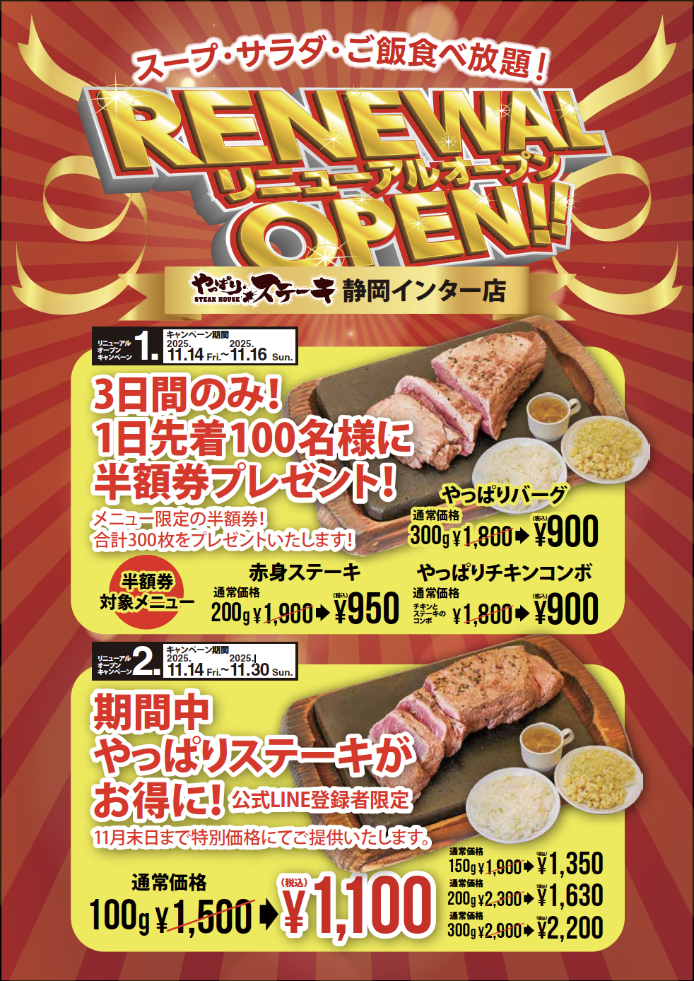 【やっぱりステーキ】やっぱりステーキ 静岡インター店がリニューアルOPEN!おいしさも、居心地もパワーアップ!11月14日から“半額&特別価格”のキャンペーンを実施