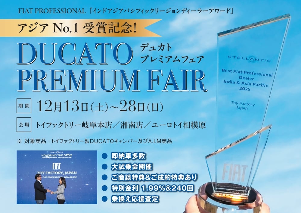 【アジアNo.1受賞記念】トイファクトリー、特別商談フェア「DUCATO PREMIUM FAIR」開催!待望の即納車や特別金利など豪華特典が充実
