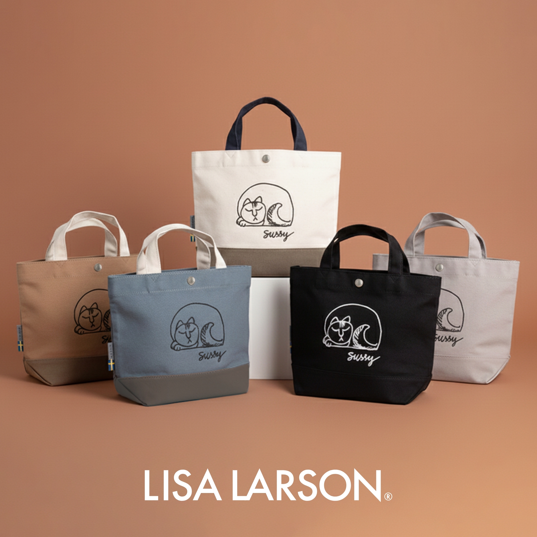 【新商品】リサ・ラーソンの猫の「スッシー」の刺繍ミニトート。A5サイズがすっぽり・軽量約164gの万能バッグが5色展開で発売