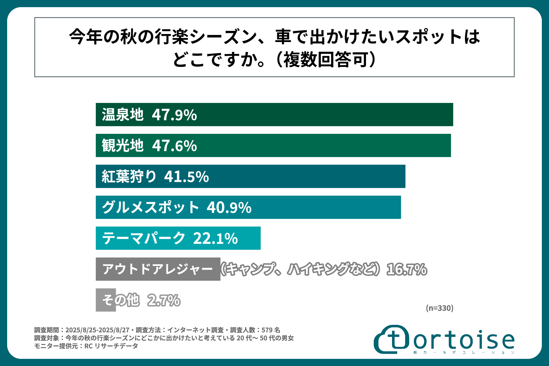今秋の行楽シーズンに車で出かける意向の20代~50代の男女が、車で出かけたいスポット1位は「温泉地」!株式会社トータスが「2025年秋の行楽シーズン、車で出かけたい場所に関する調査」を実施!