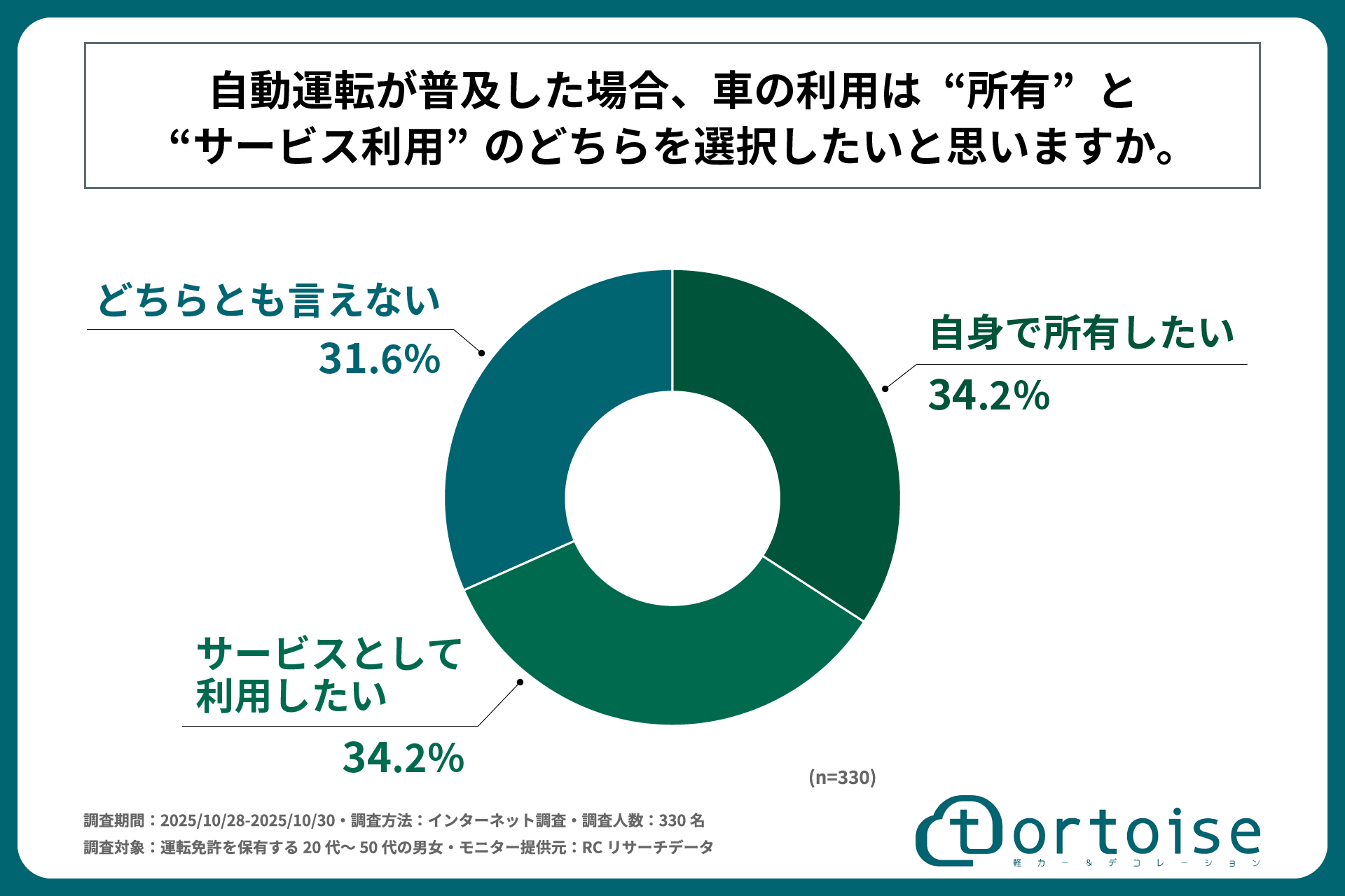 運転免許を保有する20代~50代の男女の約35%が自動運転が普及した場合でも、車の利用意向として「自身で所有したい」と回答!株式会社トータスが「自動運転搭載車の利用意向に関する調査」を実施!