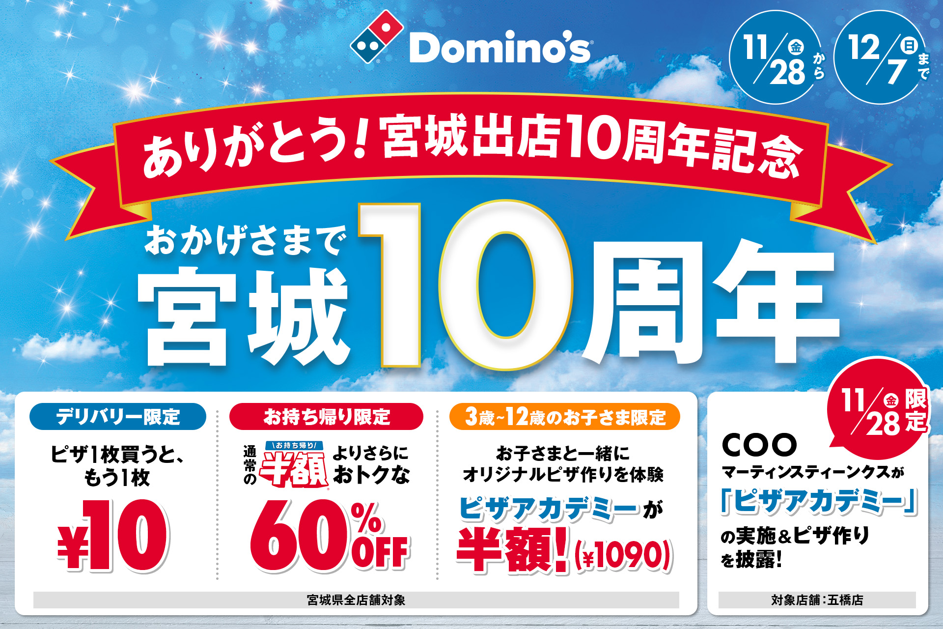 ドミノ・ピザ、宮城県の皆さまに“ありが10(とう)”を込めた「ありがとう!宮城出店10周年記念」11月28日(金)~12月7日(日)開催!~4つの特別キャンペーンでピザを楽しむ10日間~